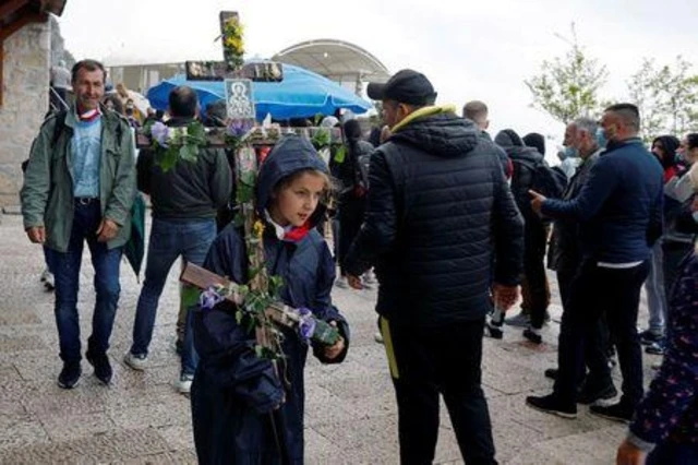 Một cô bé mang cây thánh giá được trang trí hoa trong chuyến hành hương đến Tu viện Ostrog ở Niksic, Montenegro. Ảnh: REUTERS