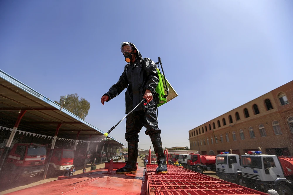 Một thành viên của Phòng vệ dân sự Yemen xịt khử trùng một xe tải ở Sanaa. Ảnh: GETTY