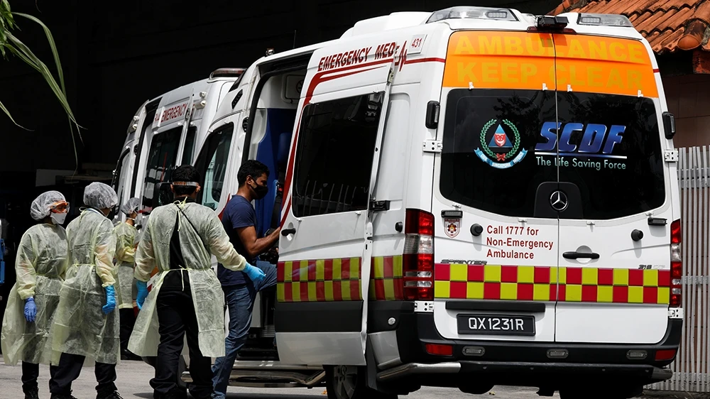 Nhân viên y tế giúp một người lao động nhập cư bước lên xe cứu thương tại một khu ký túc cho người nhập cư ở Singapore. Ảnh: REUTERS