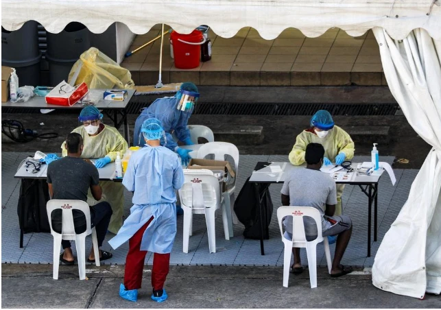 Nhân viên y tế lấy mẫu xét nghiệm cho công nhân nhập cư tại ký túc xá ở Singapore. Ảnh: REUTERS