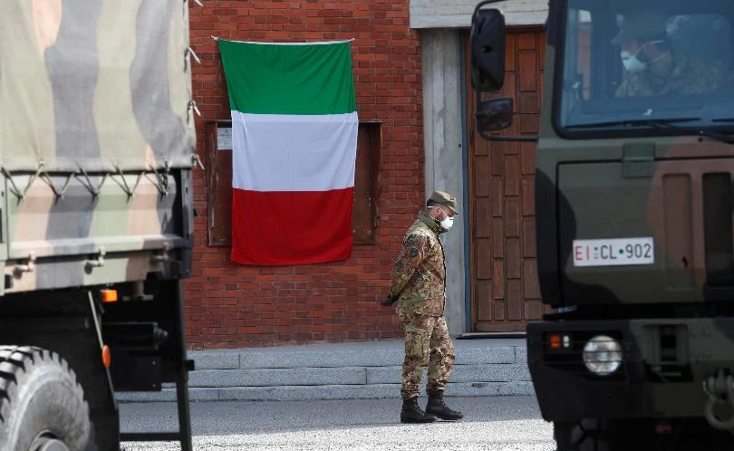 Một lá cờ Ý được treo bên ngoài nhà thờ San Giuseppe khi một binh sĩ đi qua những chiếc xe tải chờ đưa lên xe những cỗ quan tài để chở tới nhà hỏa táng ở Venice và Udine. Ảnh: AP