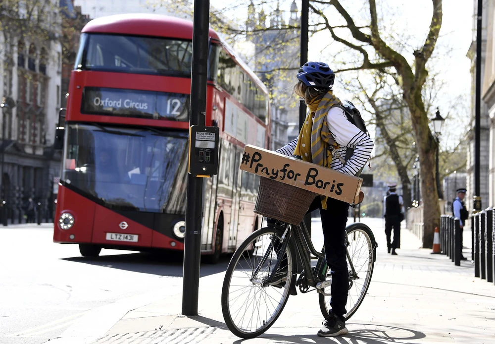 Một tấm biển ghi chữ “Cầu nguyện cho Boris” gắn trên xe đạp của một phụ nữ nhằm ủng hộ Thủ tướng Anh Boris Johnson, người đang điều trị COVID-19 tại một bệnh viện ở London. Ảnh: AP