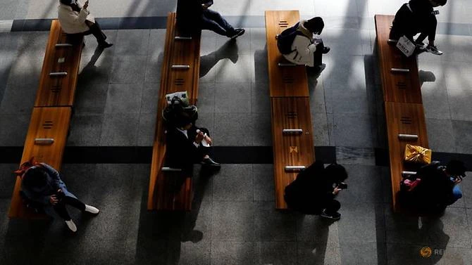 Các hành khách giữ khoảng cách với nhau khi ngồi trên băng ghế tại một nhà ga ở Daegu, Hàn Quốc. Ảnh: REUTERS