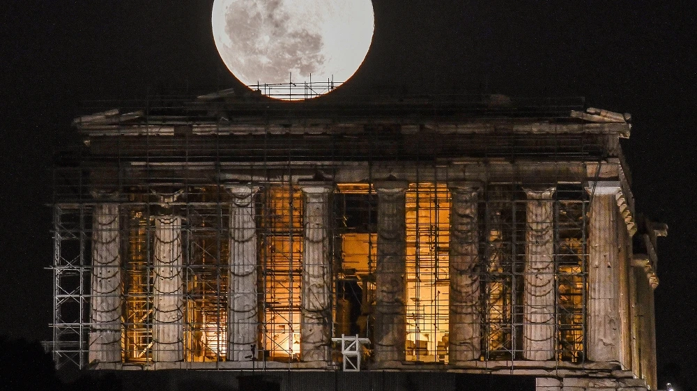 Mặt trăng nhô lên trên đền Parthenon ở Athens, Hy Lạp. Ảnh: AFP