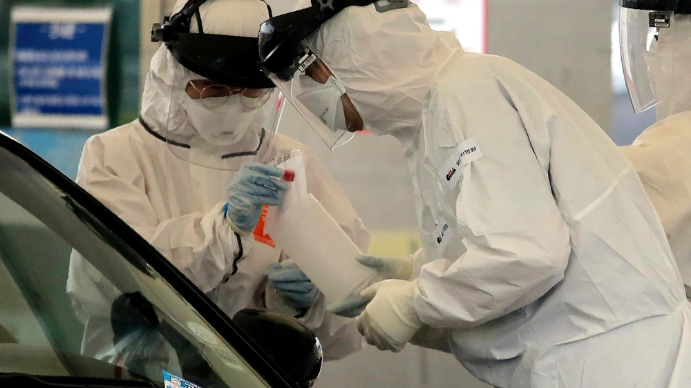 Nhân viên y tế trong một trạm xét nghiệm COVID-19 ở thủ đô Seoul, Hàn Quốc (Ảnh chụp ngày 12-3). Ảnh: AFP