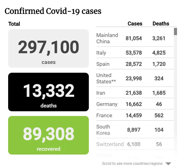 Báo South China Morning Post (SCMP) dẫn số liệu từ Ủy ban Y tế Quốc gia Trung Quốc (NHC) cho biết tính đến 19 giờ ngày 22-3, tổng số ca tử vong trên toàn cầu vì dịch viêm đường hô hấp cấp do virus SARS-CoV-2 gây ra (dịch COVID-19) là 13.332, tổng số ca nhiễm là 297.100.
