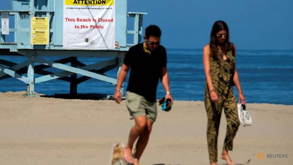 Người dân đi ngang qua bãi biển ở TP Los Angeles, bang California bất chấp cấm hôm 4-7. Ảnh: REUTERS