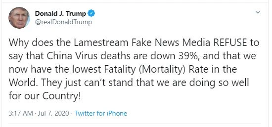 Ngày 6-7, Tổng thống Donald Trump đã có hàng loạt trạng thái trên Twitter nói rằng tỉ lê tử vong vì COVID-19 đang giảm và có những chỉ trích nhắm vào giới truyền thông.