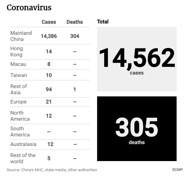 Tính đến chiều 2-2, số ca nhiễm virus Corona trên toàn cầu được xác nhận là 14.562 ca, với 304 trường hợp tử vong ở Trung Quốc và một ở Philippines, theo South China Morning Post.