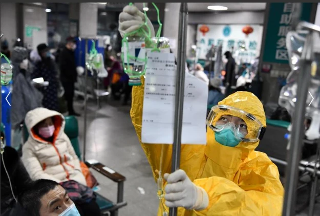Một nhân viên y tế tại Vũ Hán đang điều chỉnh túi chuyền thuốc cho bệnh nhân. Ảnh: REUTERS