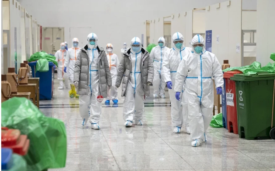 Nhân viên y tế làm việc trong một bệnh viện tạm thời được chuyển đổi từ một trung tâm triển lãm ở Vũ Hán, Trung Quốc. Ảnh: TÂN HOA XÃ