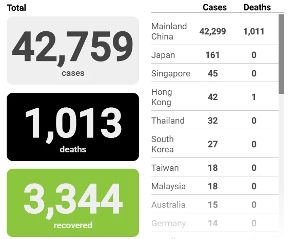 Theo tờ South China Morning Post dẫn số liệu từ Ủy ban Y tế Quốc gia Trung Quốc (NHC), tính đến 6 giờ 9 phút sáng 11-2, tổng số ca tử vong trên toàn thế giới vì dịch viêm đường hô hấp cấp do chủng mới của virus Corona (2019-nCoV), gọi tắt là dịch Corona, là 1.013 ca và 42.759 ca nhiễm.