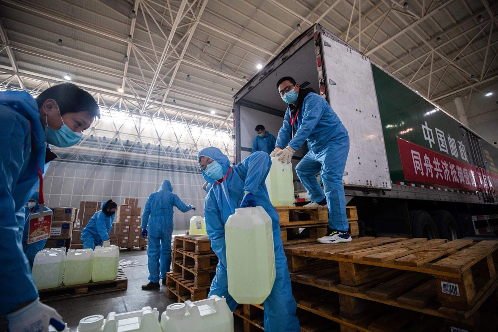 Các nhân viên y tế ở Vũ Hán vận chuyển các thiết bị y tế (Ảnh chụp ngày 10-2). Ảnh: AFP