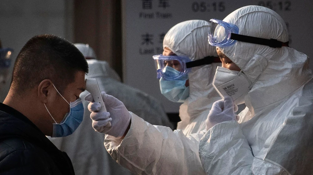 Nhân viên y tế Trung Quốc kiểm tra thân nhiệt của hành khách tại một ga tàu ở thủ đô Bắc Kinh (Ảnh chụp ngày 4-2). Ảnh: AFP
