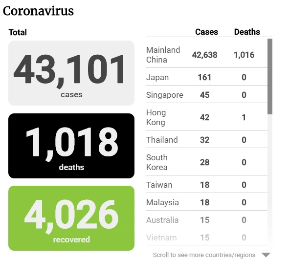 Theo tờ South China Morning Post (SCMP) dẫn nguồn từ Ủy ban Y tế quốc gia Trung Quốc, tính đến 1 giờ chiều 11-2, trên toàn thế giới ghi nhận 43.101 ca nhiễm chủng virus Corona mới (2019-nCoV).