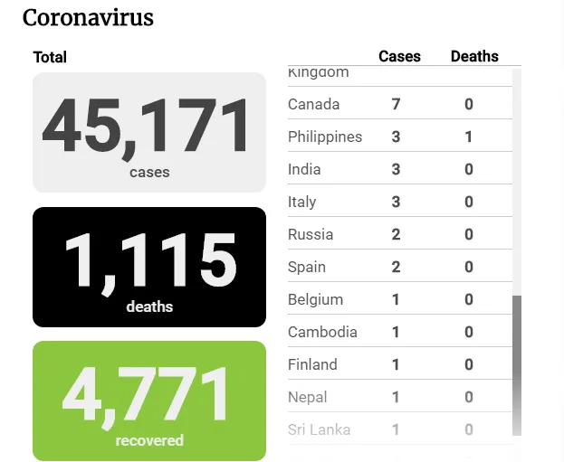 Riêng số ca tử vong và ca nhiễm tại Trung Quốc đại lục lần lượt là 1.113 và 44.653, hầu hết số ca tử vong là tại tâm dịch Hồ Bắc.