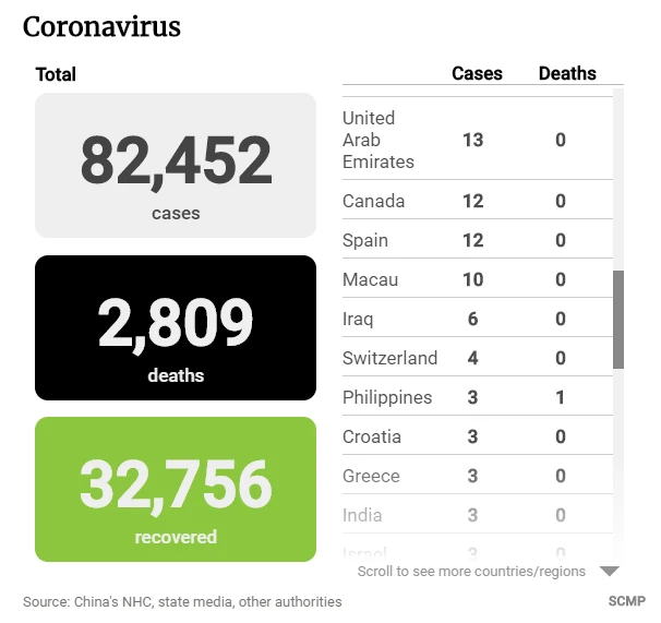 Tờ South China Morning Post dẫn nguồn Ủy ban Y tế quốc gia Trung Quốc ghi nhận tính đến 19 giờ 10 tối 27-2, có 2.809 người tử vong vì bệnh viêm đường hô hấp cấp do virus COVID-19 gây ra. Số ca nhiễm trên toàn cầu là 82.452 ca.
