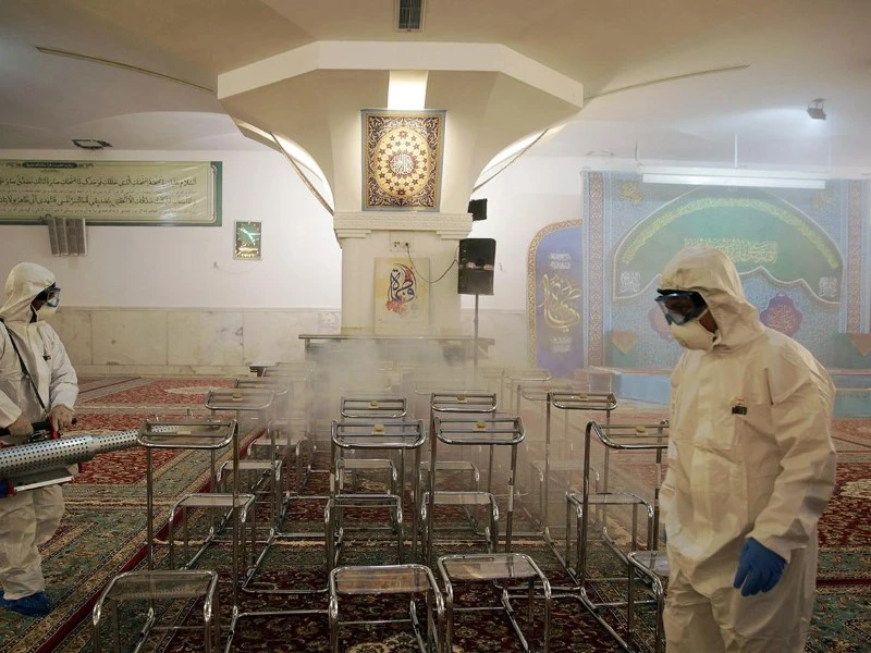 Nhân viên y tế khử trùng Nhà thờ Imam Reza ở TP Mashhad, Iran ngày 1-3. Ảnh: REUTERS