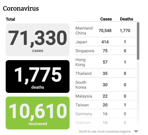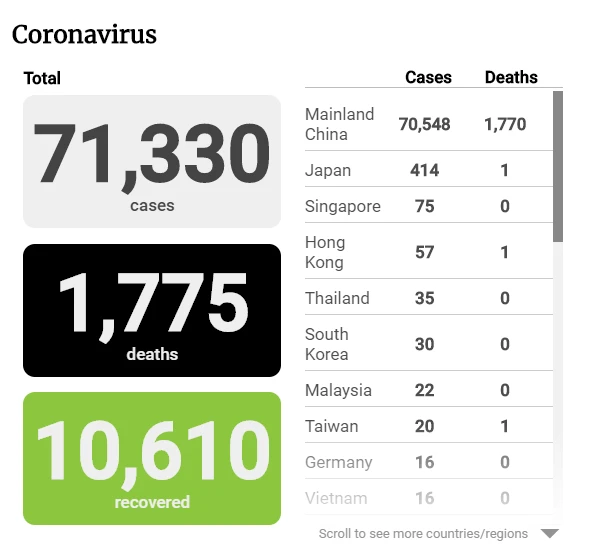 Tờ South China Morning Post dẫn nguồn Ủy ban Y tế quốc gia Trung Quốc ghi nhận tính đến chiều 17-2, đã có 1.775 ca tử vong vì bệnh COVID-19, với 71.330 ca nhiễm.
