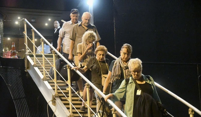 Một nhóm hành khách trên du thuyền Westerdam rời tàu ngày 14-2. Ảnh: KYODO