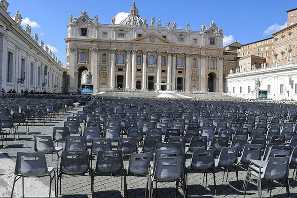 Những hàng ghế trống trước quảng trường St Peter (Vatican). Tuy khu vực này không nằm trong danh sách bị cách ly nhưng cũng không có du khách đến dự lễ giống như trước đó. Ảnh: EPA