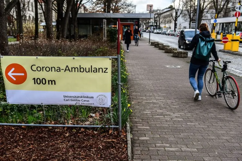 Một biển báo về phòng khám virus Corona treo tại lối vào Bệnh viện ĐH Dresden ở Dresden, Đức. Ảnh: EPA-EFE