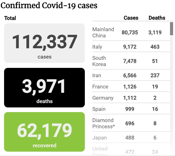 Báo South China Morning Post (SCMP) dẫn số liệu từ Ủy ban Y tế Quốc gia Trung Quốc cho biết tính đến 6 giờ ngày 10-3, tổng số ca tử vong trên toàn cầu vì dịch viêm đường hô hấp cấp do virus Corona chủng mới (COVID-19) gây ra là 3.971. Tổng số ca nhiễm là 112.337. Có 62.179 ca chữa khỏi.