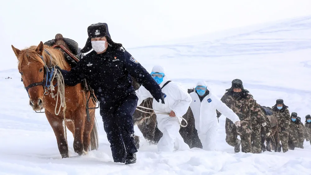Cảnh sát tới những khu vực xa xôi ở Altay, vùng Tân Cương, Trung Quốc để nâng cao ý thức về dịch COVID-19. Ảnh: AFP