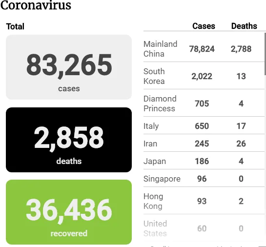 Báo South China Morning Post (SCMP) dẫn số liệu từ Ủy ban Y tế Quốc gia Trung Quốc (NHC) cho biết tính đến 8 giờ 33 phút ngày 28-2, tổng số ca tử vong trên toàn cầu vì dịch viêm đường hô hấp cấp (COVID-19) do virus Corona chủng mới gây ra là 2.858. Tổng số ca nhiễm là 83.265. Trong đó, số ca tử vong và ca nhiễm tại Trung Quốc lần lượt là 2.788 và 78.824. Có 36.436 ca chữa khỏi.