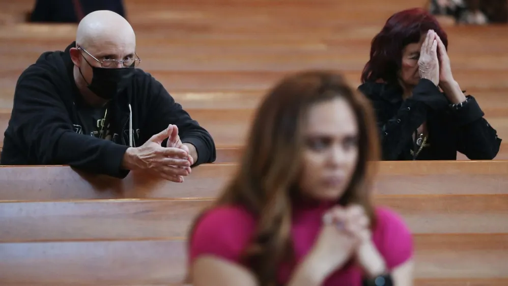 Một tín đồ đeo khẩu trang tại một nhà thờ ở Los Angeles (Mỹ). Ảnh: AFP