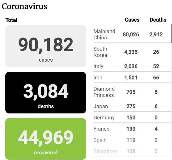 Báo South China Morning Post (SCMP) dẫn số liệu từ Ủy ban Y tế Quốc gia Trung Quốc cho biết tính đến 6 giờ 11 phút ngày 3-3, tổng số ca tử vong vì dịch viêm đường hô hấp cấp do virus Corona chủng mới (COVID-19) gây ra là 3.084. Tổng số ca nhiễm là 90.182. Có 44.969 ca được chữa khỏi.