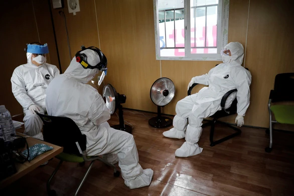 Nhân viên y tế nghỉ giải lao tại một trạm kiểm tra COVID-19 ở Trung tâm Y tế Đại học Yeungnam, Daegu (Hàn Quốc). Ảnh: REUTERS