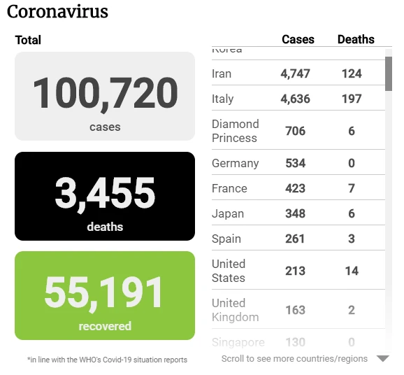 Báo South China Morning Post (SCMP) dẫn số liệu từ Ủy ban Y tế Quốc gia Trung Quốc (NHC) cho biết tính đến 6 giờ 25 phút sáng ngày 7-3, tổng số ca tử vong trên toàn cầu vì dịch viêm đường hô hấp cấp do virus Corona chủng mới (COVID-19) gây ra là 3.455 (tăng 54 ca so với số liệu tối qua). Tổng số ca nhiễm là 100.720 ca. Có 55.191 ca chữa khỏi.