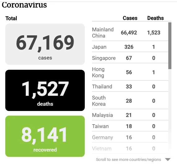 Báo South China Morning Post (SCMP) dẫn số liệu từ Ủy ban Y tế Quốc gia Trung Quốc (NHC) cho biết tính đến 18 giờ 20 phút tối 15-2, tổng số ca tử vong trên toàn thế giới vì dịch viêm đường hô hấp cấp do chủng mới của virus Corona (COVID-19) là 1.527 và số ca nhiễm là 67.169. Có 8.141 ca nhiễm được chữa khỏi.