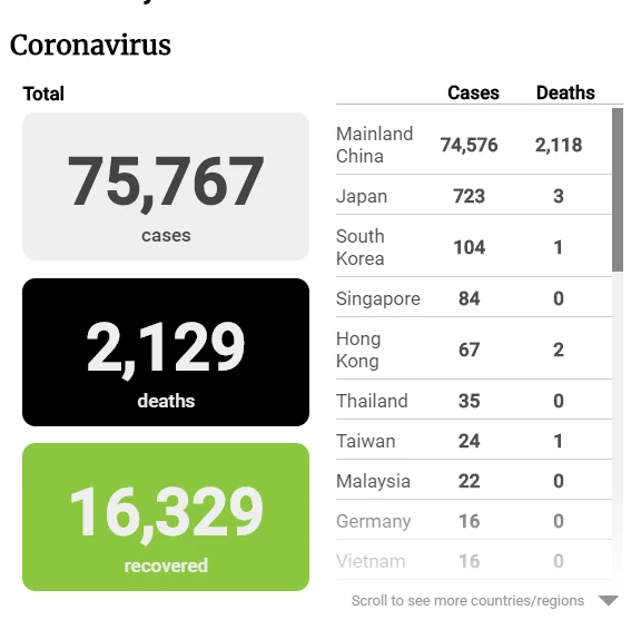 Tờ South China Morning Post dẫn nguồn Ủy ban Y tế quốc gia Trung Quốc ghi nhận tính đến 18 giờ 40 ngày 20-2, có 2.129 người tử vong vì bệnh viêm đường hô hấp cấp do virus COVID-19 gây ra, 75.767 ca nhiễm.