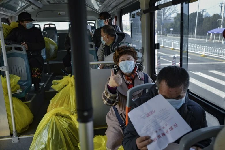 Những bệnh nhân nhiễm COVID-19 đã được chữa khỏi và xuất viện đi trên một xe buýt được chỉ định ở Vũ Hán, Trung Quốc. Ảnh: EPA-EFE