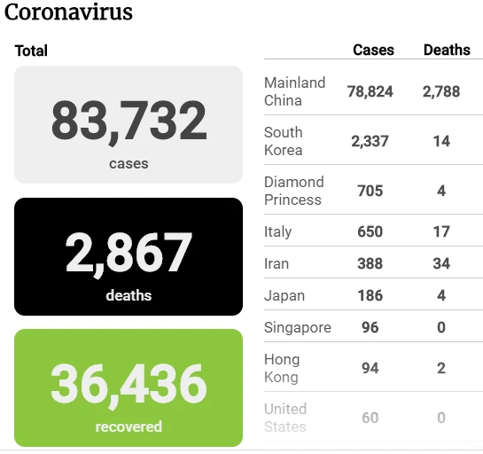 Báo South China Morning Post (SCMP) dẫn số liệu của Ủy ban Y tế Quốc gia Trung Quốc (NHC) cho biết tính đến 18 giờ 30 ngày 28-2, tổng số ca tử vong trên toàn cầu vì dịch viêm đường hô hấp cấp do virus Corona chủng mới gây ra (COVID-19) là 2.867 (tăng chín ca so với trưa cùng ngày). Tổng số ca nhiễm là 83.732. Có 36.436 ca được chữa khỏi.