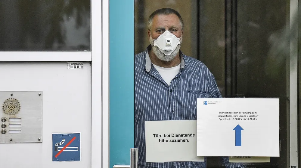 Một nhân viên đeo khẩu trang đứng chờ sau cánh cửa một trung tâm xét nghiệm COVID-19 ở Duesseldorf, Đức. Ảnh: AP