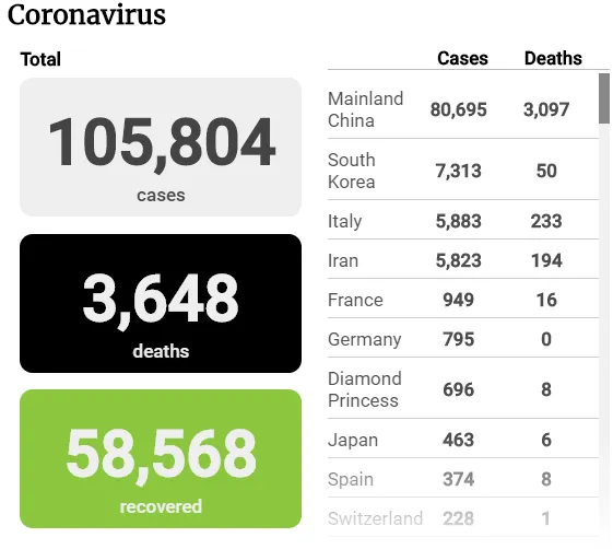 Báo South China Morning Post (SCMP) dẫn số liệu từ Ủy ban Y tế Trung Quốc (NHC) cho biết tính đến 18 giờ 50 ngày 8-3, tổng số ca tử vong trên toàn cầu vì dịch viêm đường hô hấp cấp do virus SARS-Cov-2 gây ra (dịch COVID-19) là 3.648 (tăng 51 ca so với trưa cùng ngày). Tổng số ca nhiễm là 105.804. Có 58.568 ca được chữa khỏi.
