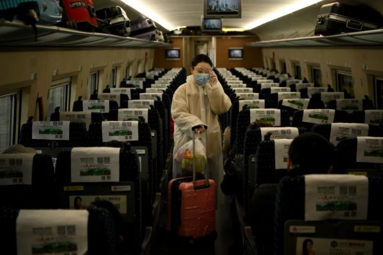 Một phụ nữ đeo khẩu trang tìm chỗ ngồi trên một tàu lửa ở ga tàu Jiujiang, tỉnh Giang Tây (Trung Quốc). Ảnh: AP
