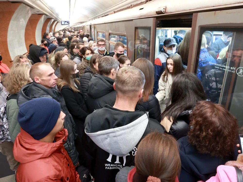 Một số hành khách không đeo khẩu trang tại ga Park Pobedy, thủ đô Moscow, Nga. Ảnh: TASS
