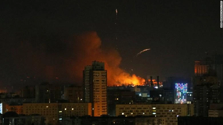 Khói và lửa bốc lên trong các cuộc pháo kích gần Kiev đầu ngày 26-2. Ảnh: CNN
