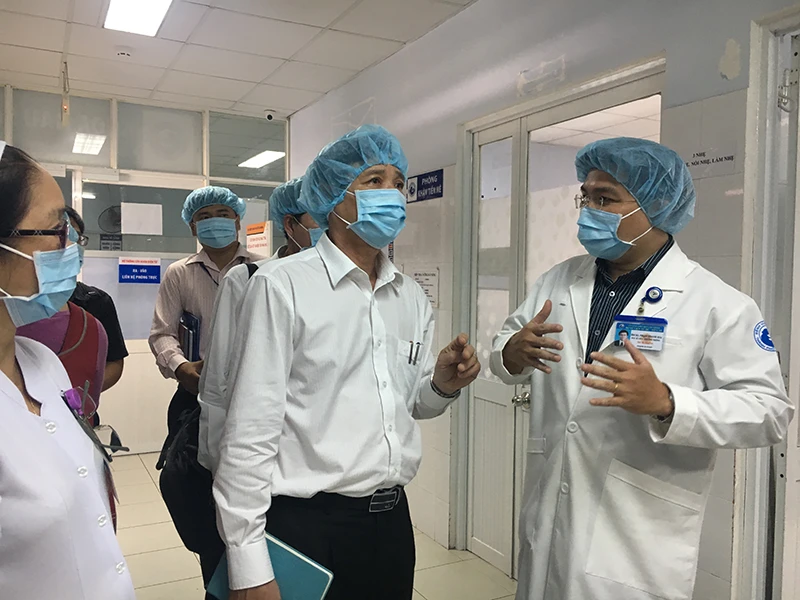 BS Nguyễn Hữu Hưng, Phó Giám đốc Sở Y tế TP.HCM (trái), đi kiểm tra công tác khử khuẩn tại BV Từ Dũ. Ảnh: HL