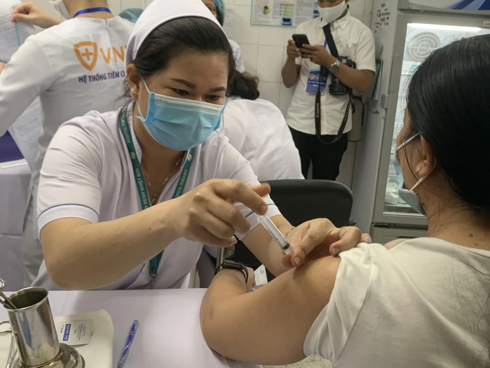 Nhân viên Bệnh viện Bệnh Nhiệt đới đang được tiêm vaccine ngừa COVID-19. Ảnh: HL