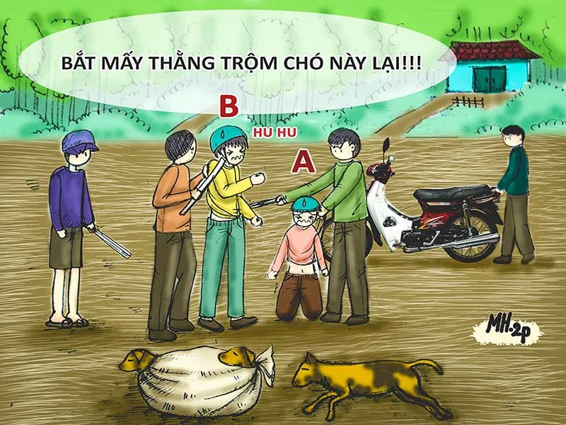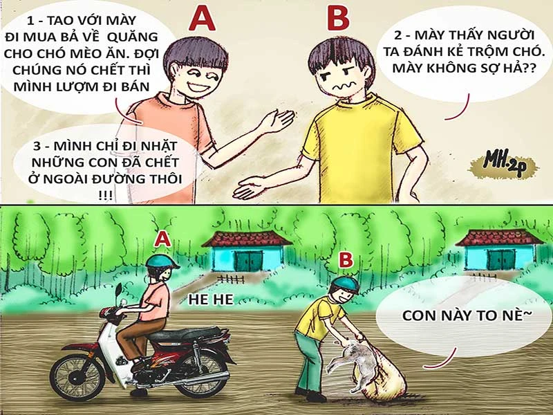 Nghe vậy, B lo lắng: “Mày không thấy mấy vụ người dân đốt xe, đánh chết tụi trộm chó hả?”. A cười tự tin: “Mày đừng lo, tụi mình quăng bả xong thì đi chỗ khác, đợi một lúc sau mới quay lại. Gặp con nào chết ngoài đường thì nhặt. Ai mà biết được”. Nghe có lý, B đồng ý.