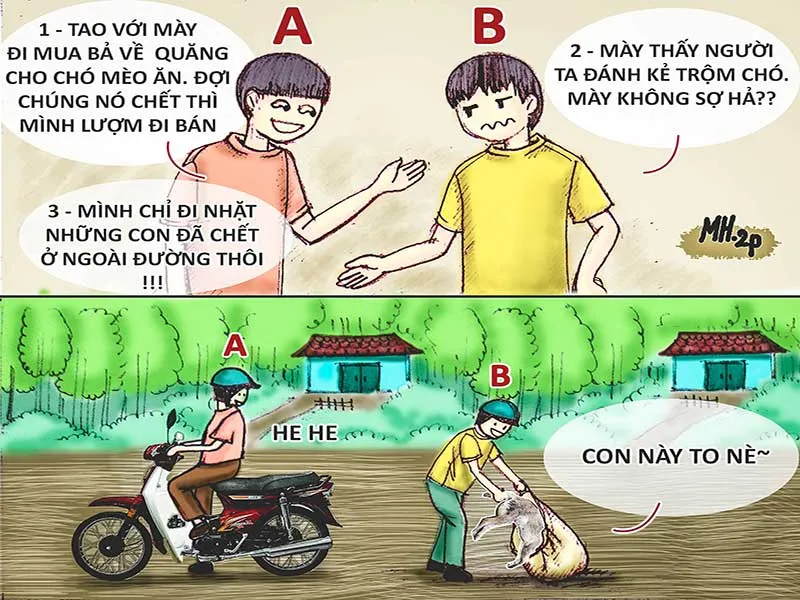 Do thiếu tiền tiêu xài, A rủ rê B: “Tao với mày đi mua bả về thuốc chó, mèo đem về bán kiếm tiền xài”. Nghe vậy, B lo lắng: “Mày không thấy mấy vụ người dân đốt xe, đánh chết tụi trộm chó hả?”. A cười tự tin: “Mày đừng lo, tụi mình quăng bả xong thì đi chỗ khác, đợi một lúc sau mới quay lại. Gặp con nào chết ngoài đường thì nhặt. Ai mà biết được”. Nghe có lý, B đồng ý.
