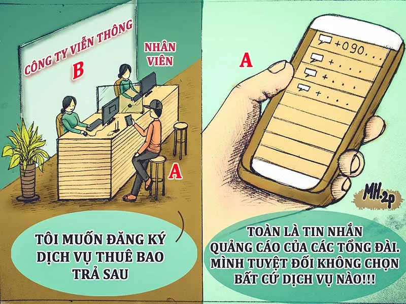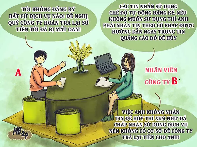 Bực mình, A đến trụ sở của Công ty Viễn thông B khiếu nại yêu cầu Công ty Viễn thông B hoàn trả số tiền trên. Tuy nhiên, đại diện Công ty B cho rằng các tin nhắn sử dụng chế độ tự động đăng ký sử dụng. Nếu anh A không muốn sử dụng thì phải nhắn tin theo cú pháp được hướng dẫn ngay trong tin nhắn đó để hủy. Việc anh A không nhắn tin để hủy thì xem như đã chấp nhận sử dụng dịch vụ nên không có cơ sở để công ty trả lại tiền cho anh. Trước giải thích của Công ty B, anh A “cứng họng” nên đành cầu cứu các chuyên gia của À Ra Thế.