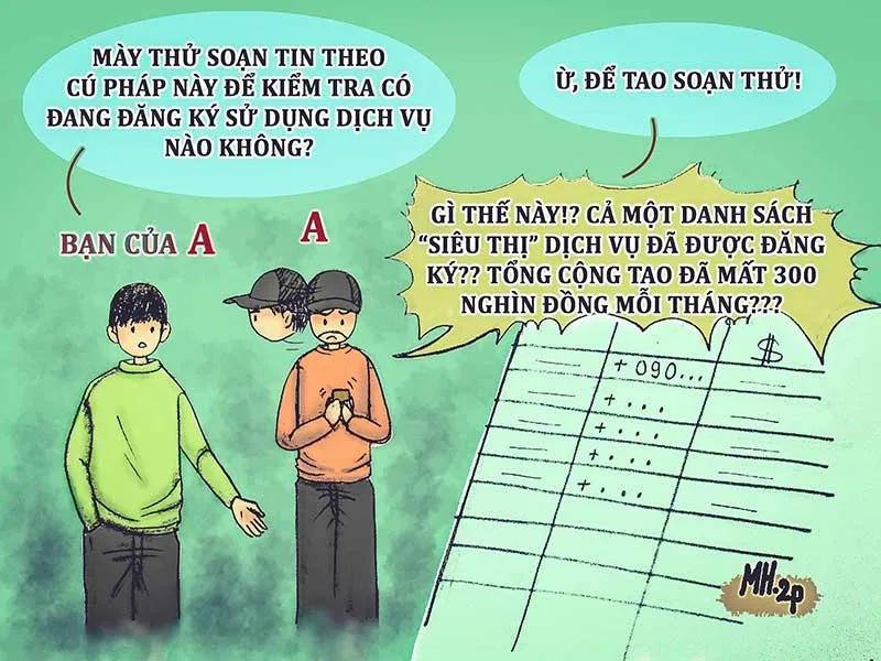 Trong một lần trò chuyện, bạn của A mách nước: “Mày thử soạn tin theo cú pháp này để kiểm tra có đang đăng ký sử dụng dịch vụ nào không?”. Làm theo, A “tá hỏa” khi thấy điện thoại đăng ký sử dụng nhiều dịch vụ mà mình không hề hay biết. Kiểm tra lại cước phí, A thấy rằng những dịch vụ này đã âm thầm lấy đi của mình 300.000 đồng mỗi tháng.