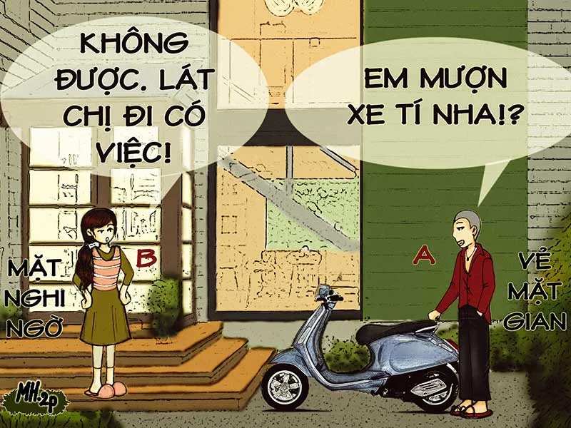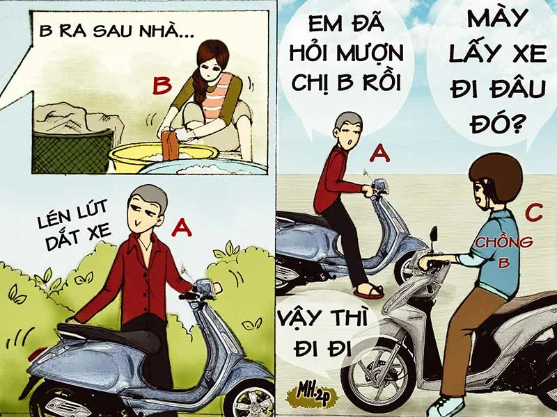 Dĩ nhiên, đã không lo làm ăn thì túi A thường xuyên rỗng không bên cạnh nhu cầu của bao nhiêu cuộc chơi đầy cám dỗ. Trong một lần như vậy, gặp cái khó ló cái… ngu, A liền nghĩ đến việc chiếm đoạt xe máy của chị B ở gần nhà. Khi sang nhà, A nói với chị B cho mình mượn xe máy nhưng vốn dĩ nghe danh A đã lâu, chị B liền viện cớ để từ chối ngay. Tưởng như vậy là đã xong, không ngờ khi chị B ra sau nhà giặt đồ thì ở phía trước, A lén lấy chìa khóa nổ máy xe chạy đi. Khi A vừa ra đến đầu hẻm thì anh C là chồng chị B cũng vừa đi làm về tới chặn đầu xe A lại hỏi: “Mày lấy xe đi đâu đó?”. Lần này thì A nhanh trí: “Em đã hỏi mượn chị B rồi”. Nghe vậy, anh C không chút nghi ngờ, để A lấy xe đi.