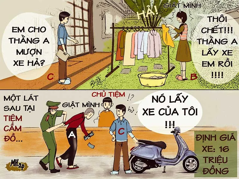Về đến nhà, anh C liền hỏi vợ: “Em cho thằng A mượn xe hả?”. Nghe vậy, chị B hốt hoảng: “Thôi chết! Thằng A lấy xe em rồi”. Ngay lập tức, vợ chồng chị B - anh C đến công an trình báo về việc bị mất xe. Nhờ sự tận tình của các anh công an, A bị bắt tại tiệm cầm đồ khi đang thực hiện việc cầm chiếc xe máy. Qua định giá tài sản, chiếc xe máy trị giá 16 triệu đồng.